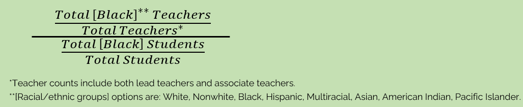 To view a specific racial/ethnic group of interest, use the selection bar to the right of the map. The formula to calculate the ratio of teacher percentage and student percentage of a given racial/ethnic group was defined as: